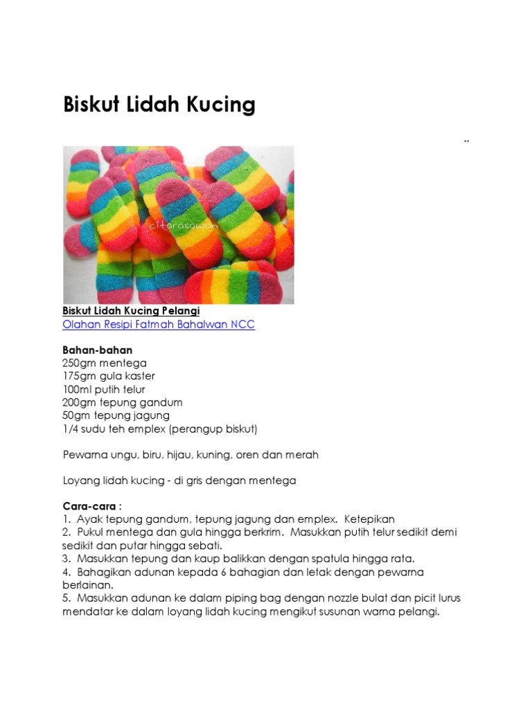 Kucingmu sering sakit karena serangan kutu? 4.2/5 based on 17 reviews. 250g mentega 175g gula kaster 100ml putih telur (lebih… masukkan setiap adunan kedalam pipping bag dengan nozzle bulat dan picit adunan dengan lurus mendatar kedalam acuan lidah kucing mengikut susunan warna pelangi. Resepi biskut lidah kucing/rainbow cookies ,oleh:nur aliya azura, like: 0%0% found this document useful, mark this document as useful.